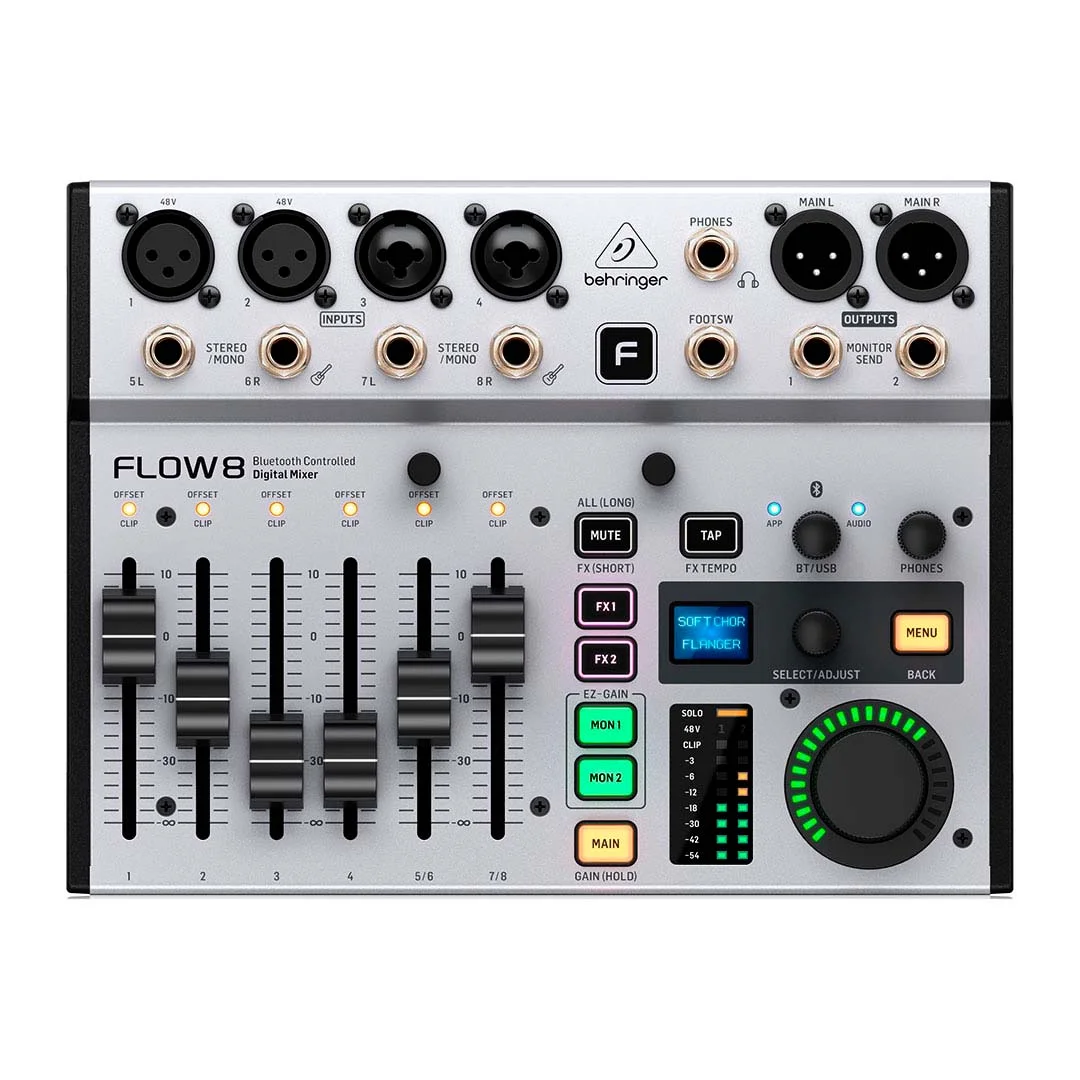 El mezclador digital Behringer FLOW8 de 8 entradas proporciona una interfaz fácil de usar, preamplificadores automáticos y una vista de escenario intuitiva para ayudarlo a lograr una mezcla en un santiamén.