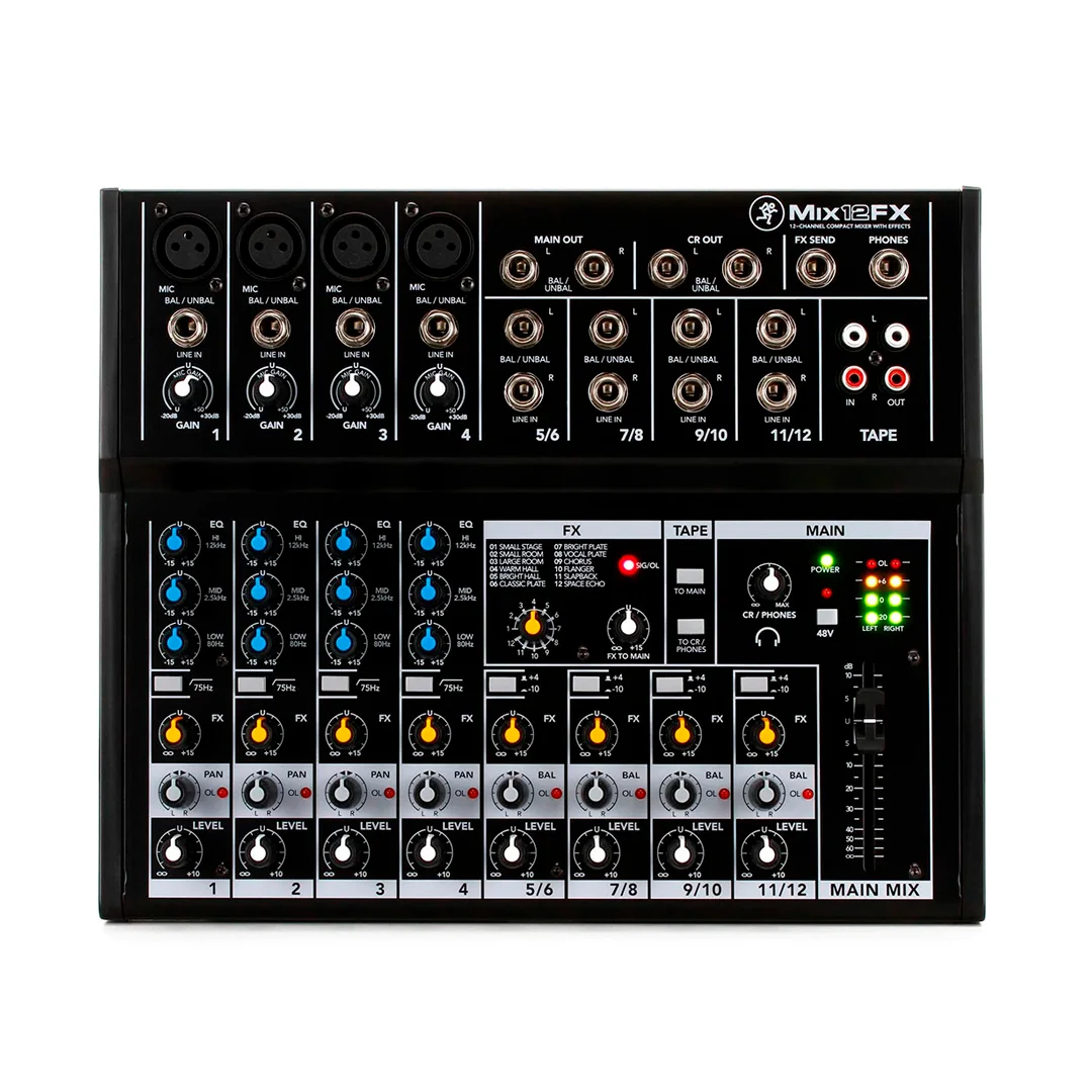 Mezclador de escritorio de 12 entradas con 4 preamplificadores de micrófono, 4 canales estéreo, ecualizadores de 3 bandas, E/S de cinta, niveles de auriculares de volumen separados y un bus de efectos con 12 efectos integrados