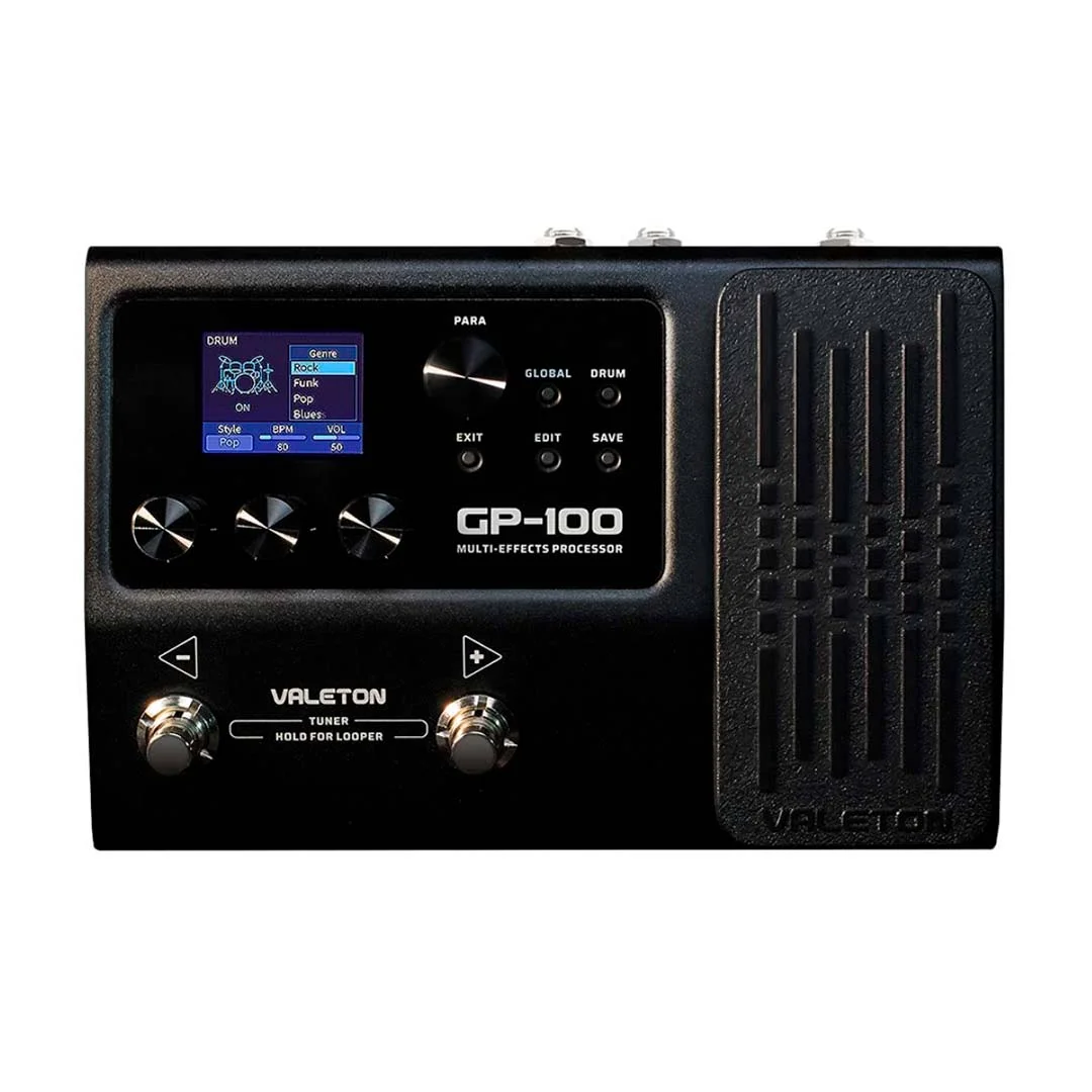 Valeton GP-100 es un pequeña y potente solución de fectos para guitarra/bajo. En un recinto de chasis de metal resistente y de bolsillo, ofrece el legendario tono orgánico de los amplificadores/efectos a través de una avanzada tecnología de modelado.