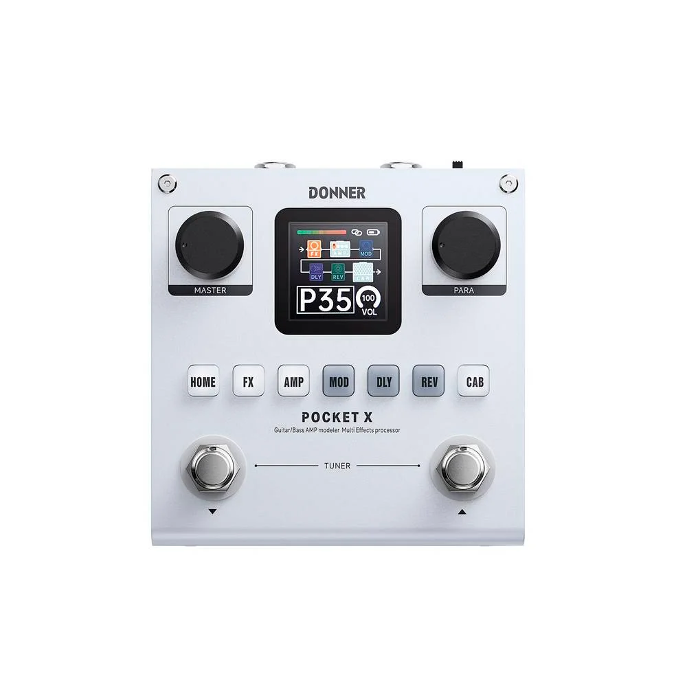 El Donner Pocket-X es un procesador multiefectos ultra compacto diseñado para guitarristas y bajistas que buscan potencia, versatilidad y portabilidad en un solo dispositivo. Equipado con seis módulos de efectos personalizables, incluye opciones como puerta de ruido, booster, compresor, ecualizador de 3 bandas, modulaciones, delays, reverbs y hasta 20 preamplificadores de alta calidad, brindando una experiencia sonora profesional tanto en vivo como en estudio. Además, incorpora 20 ranuras para IRs de gabinetes, lo que permite simular distintas cajas acústicas o cargar respuestas impulsionales personalizadas para adaptar el tono a cualquier estilo o entorno.